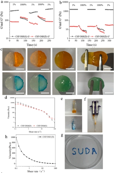 圖4. CSF/OSH (D)水凝膠的自愈性能和可注射性能