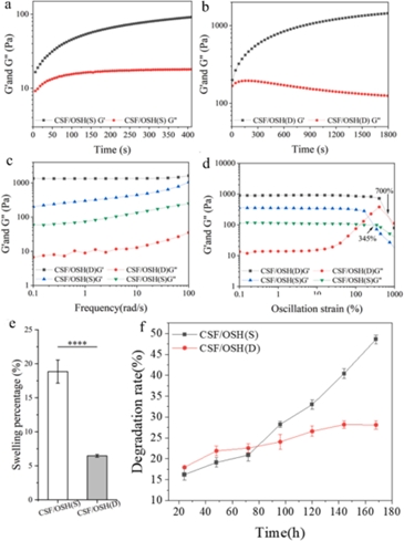 振蕩應變掃描曲線結果顯示,測試初期CSF/OSH(S)、(D)水凝膠的G’和G”保持平行,說明此時水凝膠內(nèi)部網(wǎng)絡結構比較均勻,沒有發(fā)生明顯的結構松弛或破壞。在PBS中孵育24小時后的溶脹性能結果顯示,CSF/OSH (D) 顯示出相對較低程度的腫脹。體外降解實驗結果表明,“動態(tài)-共價”雙交聯(lián)網(wǎng)絡可以有效減少凝膠中兩種組分的質(zhì)量損失,從而顯著降低其降解率。流變測試結果顯示,CSF/OSH(S)和(D)水凝膠的機械行為表現(xiàn)出顯著的應變依賴性狀態(tài)。剪切速率掃描結果顯示,CSF/OSH(S)和(D)水凝膠的復合粘度隨著剪切速率的增加而逐漸降低,表明CSF/OSH(S)和(D)水凝膠均具有一定的可注射性能。在 37℃ 下粘度流變測試結果顯示,粘度隨著溫度升高而降低,隨著剪切速率的增加而降低。