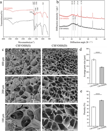 CSF和OSH基于席夫堿反應,混合后會自發(fā)凝膠化。通過前期研究發(fā)現(xiàn),當CSF/OSH的體積比為1/2時,CSF/OSH具有更好的理化性能和基本成型能力。從紅外光譜曲線可以看出,CSF/OSH雙交聯(lián)(D)水凝膠中雙交聯(lián)網(wǎng)絡內(nèi)的氨基和羧基之間形成了穩(wěn)定的酰胺鍵,以及酯鍵的存在。結晶度結果表明交聯(lián)后,CSF二級結構中穩(wěn)定的Silk II結構增加,分子構象轉(zhuǎn)變?yōu)棣?折疊結構。CSF/OSH(D)水凝膠具有更致密和更均勻的多孔結構,這種多孔結構使氧氣和其他營養(yǎng)物質(zhì)能夠在水凝膠的 3D 網(wǎng)絡結構內(nèi)自由運輸。這是由于CSF/OSH(D)水凝膠體系中同時存在亞胺、酰胺和酯鍵,導致材料的交聯(lián)密度增加和交聯(lián)位點數(shù)量增加。