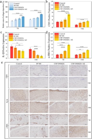 為了了解CSF/OSH(D)+AE水凝膠在真實傷口上的愈合情況,建立了糖尿病小鼠模型。結果顯示,CSF/OSH(D)+AE水凝膠組的傷口愈合速度明顯快于其他組。治療第14天,CSF/OSH(D)+AE水凝膠組已形成完整的表皮和真皮結構,并出現(xiàn)大量新生血管和毛囊,同時表現(xiàn)出最豐富的膠原蛋白沉積,傷口愈合逐漸進入重塑階段:新生血管逐漸消退,CD31的陽性表達也逐漸減少,促進膠原蛋白重組,疤痕形成減弱。