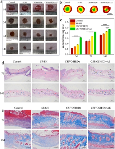 圖7. CSF/OSH (D) +AE 水凝膠的傷口愈合和組織學結果