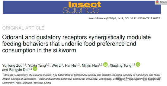 Zou, Y. L., Tang, Y. X., Li, W., Hu, H., Han, M. J., Tong, X. L. and Dai, F. Y. (2026) Odorant and gustatory receptors synergistically modulate feeding behaviors that underlie food preference and consumption in the silkworm. Insect Science, DOI 10.1111/1744-7917.70225.