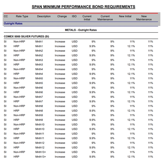 1月28日訊,芝加哥商品交易所(CME)當?shù)貢r間27日發(fā)布通知,對部分白銀(8131, -9.00, -0.11%)、鉑金和鈀金期貨合約的保證金(Outright Rates)參數(shù)進行調(diào)整。文件顯示,部分白銀合約的新保證金比例高于此前水平,約為名義價值的11%。新標準將于當?shù)貢r間1月28日收盤后生效。本次通知未涉及黃金(582, 8.80, 1.54%)相關合約。