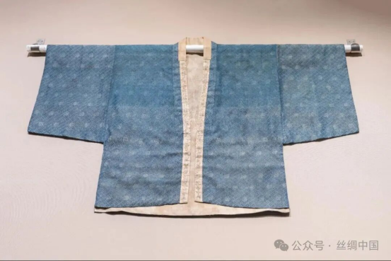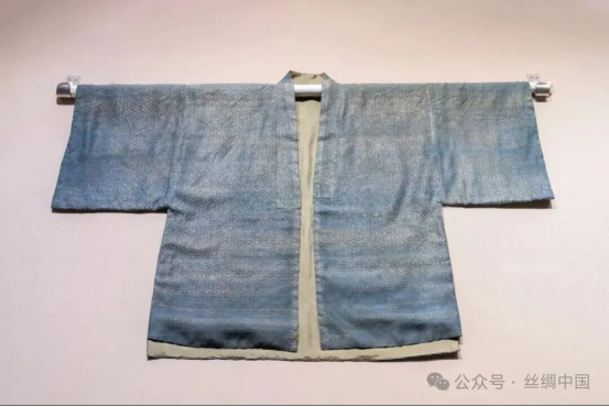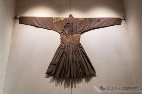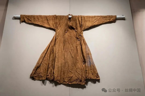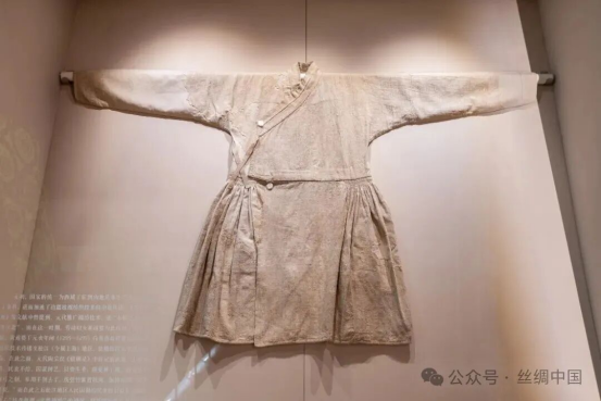 棉質(zhì),交領(lǐng),右衽,窄袖,束腰。右衽腋下有系帶,為本色絲絹,袍料以棉線為原材料,采用一上一下的平紋組織織造。經(jīng)緯線粗細(xì)不均勻,但整體織造較為規(guī)整,裁剪精良,做工細(xì)致。袍身為上衣下裳相連,上緊下松,袖口窄小。