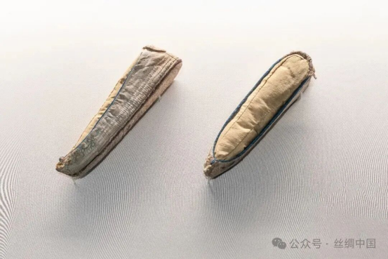 衣身面料采用纏枝花卉紋綾,僅殘存有左肩一片及腰部部分,現(xiàn)已做過(guò)修復(fù)。其中衣物的右肩部分用蹙金繡繡出扁平狀云紋及團(tuán)窠圖案,團(tuán)窠內(nèi)為一玉兔,象征月亮。據(jù)元人文獻(xiàn)中關(guān)于肩挑日月的記載,推測(cè)其左肩圖案與右肩相似,應(yīng)為代表太陽(yáng)的三足烏。其腰部則采用絹帛拈成的辮線密密釘繡成細(xì)裥,即《元史·輿服志》中所載“制如窄袖衫,腰作辮線細(xì)折”的辮線襖。這種服裝是流行于元代的一種男子袍服,其形制為右衽交領(lǐng)、緊袖,下擺較為寬大,腰間緊束,便于騎射。一直沿襲到明代,稱為曳撒,仍作為外出騎乘之服。