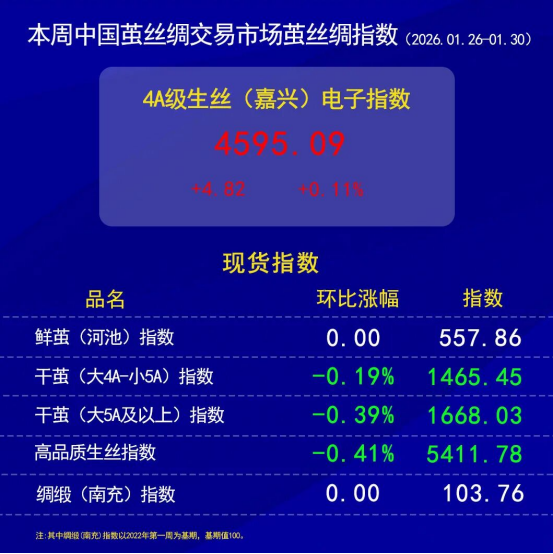 今日(2026年1月30日,周五)中國(guó)繭絲綢交易市場(chǎng)生絲電子指數(shù)微漲0.01%報(bào)收于4595.09點(diǎn),本周生絲指數(shù)累計(jì)上漲0.11%,本月生絲指數(shù)累計(jì)上漲0.33%。B絲2022D(商檢4A級(jí)生絲):260325合約上漲0.03萬(wàn)元報(bào)收于46.20萬(wàn)元;260925合約報(bào)平,收于45.69萬(wàn)元。