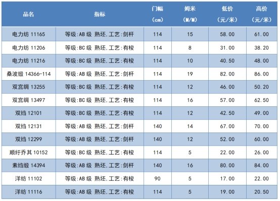 本周綢緞指數(shù)協(xié)作單位成交價(jià)格區(qū)間