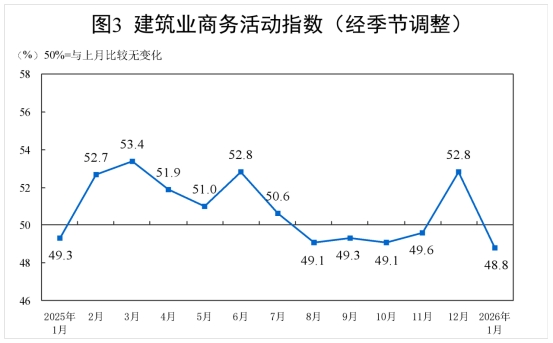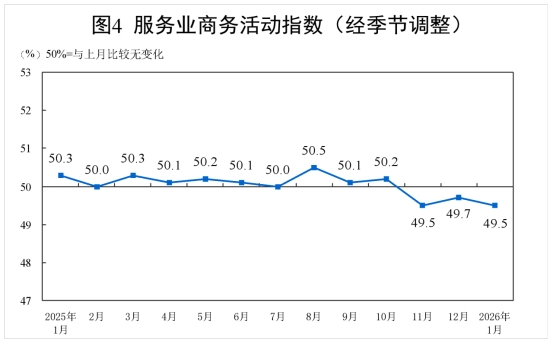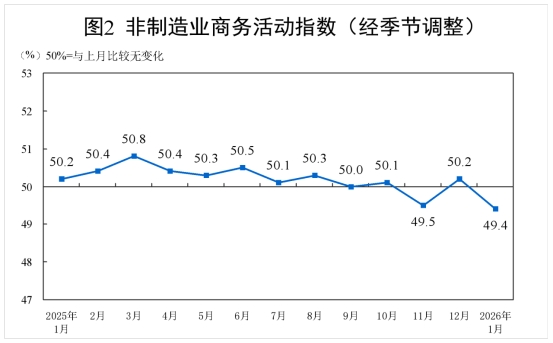 1月份,非制造業(yè)商務(wù)活動指數(shù)為49.4%,比上月下降0.8個百分點。