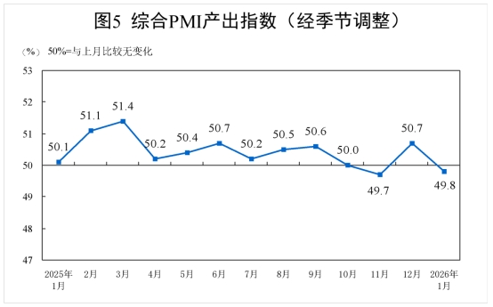 1月份,綜合PMI產(chǎn)出指數(shù)為49.8%,比上月下降0.9個百分點,表明我國企業(yè)生產(chǎn)經(jīng)營活動總體較上月有所放緩。