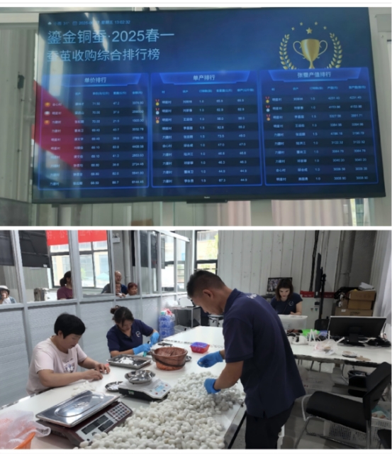 二是破“收購(gòu)難”,儀器評(píng)繭顯公平。鎏金銅蠶公司引進(jìn)鮮繭儀評(píng)電子化系統(tǒng),按“殼重、上車率、含水率、色澤、僵蛹”5項(xiàng)指標(biāo)打分,蠶農(nóng)在等候區(qū)就能通過(guò)大屏看評(píng)分、知價(jià)格。以往“毛腳繭”混著賣,現(xiàn)在6A級(jí)蠶繭每斤能多賣5-8元,“優(yōu)繭優(yōu)價(jià)”真正落地。三是提“效率難”,分段養(yǎng)殖增批次。推行“小蠶集中育、中蠶工廠育、大蠶農(nóng)戶育”的“三段式”模式,將蠶農(nóng)自養(yǎng)周期從35天壓縮到15天,全年養(yǎng)蠶批次從6批增至8批。池河鎮(zhèn)試點(diǎn)戶張產(chǎn)收益最高達(dá)4556元,比傳統(tǒng)模式多賺1000元左右。