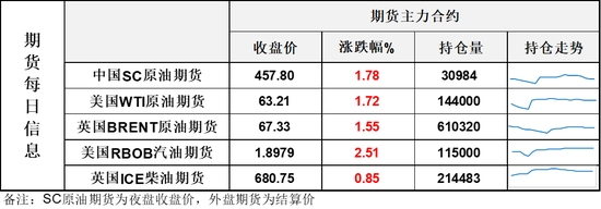 【1】WTI主力原油期貨收漲1.07美元,漲幅1.72%,報63.21美元/桶;布倫特主力原油期貨收漲1.03美元,漲幅1.55%,報67.33美元/桶;INE原油期貨收漲1.78%,報457.8元。