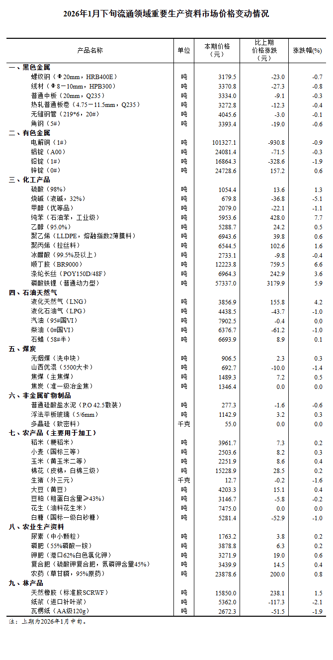 2026年1月下旬流通領(lǐng)域重要生產(chǎn)資料市場價(jià)格變動(dòng)情況