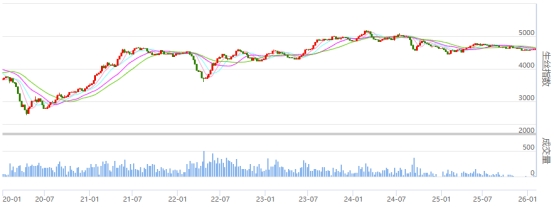 今日(周五)生絲盤面在外圍市場劇烈波動下,各遠近合約又繼續(xù)小幅收跌。260925生絲合約有所成交。本周生絲指數(shù)收出帶上影的小陽線,呈維穩(wěn)波動態(tài)勢。