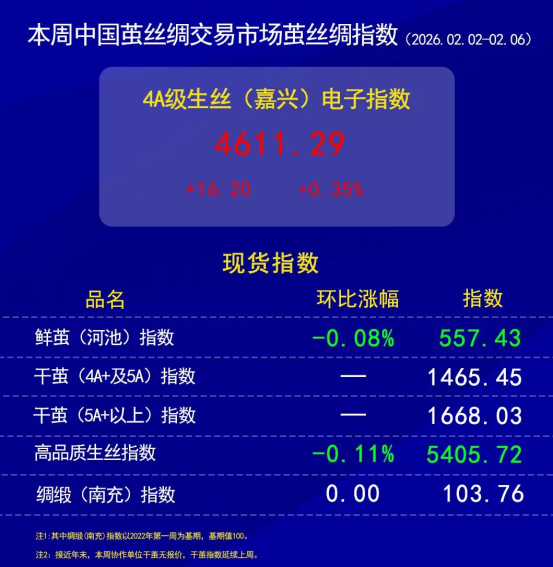 今日(2026年02月06日,周五)中國繭絲綢交易市場生絲電子指數(shù)微跌0.09%報收于4611.29點,本周生絲指數(shù)累計上漲0.35%。B絲2022D(商檢4A級生絲):260325合約下跌0.06萬元報收于46.14萬元;260925合約下跌0.12萬元報收于46.05萬元;270325合約下跌0.03萬元報收于46.11萬元。