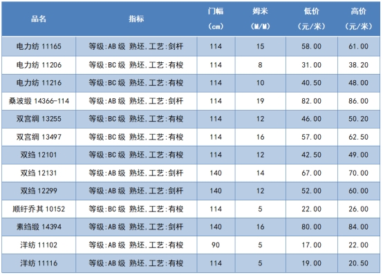 本周綢緞指數(shù)協(xié)作單位成交價格區(qū)間