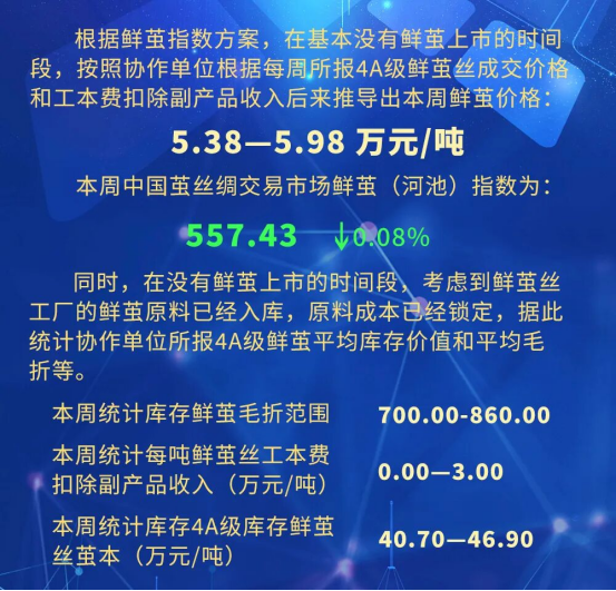 從現(xiàn)貨市場指數(shù)表現(xiàn)來看,本周鮮繭價格指數(shù)按編制規(guī)則較上周小幅收低。