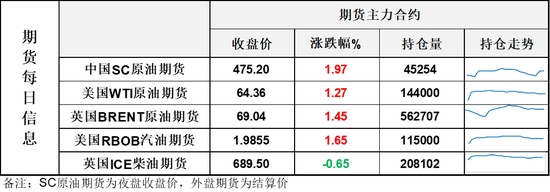 【1】WTI主力原油期貨收漲0.81美元,漲幅1.27%,報(bào)64.36美元/桶;布倫特主力原油期貨收漲0.99美元,漲幅1.45%,報(bào)69.04美元/桶;INE原油期貨收漲1.97%,報(bào)475.2元。