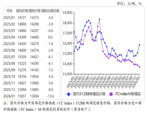 (七)預(yù)計(jì)春節(jié)后國(guó)內(nèi)棉價(jià)存在下行壓力,國(guó)際棉價(jià)偏弱震蕩。國(guó)內(nèi)市場(chǎng):春節(jié)前紡織廠補(bǔ)庫(kù)漸近尾聲,2026年新疆棉花種植面積調(diào)減信息已被市場(chǎng)逐步消化;2026年度棉花進(jìn)口關(guān)稅配額新規(guī)落地實(shí)施,內(nèi)外棉價(jià)差擴(kuò)大,紡織廠進(jìn)口意愿增加,預(yù)計(jì)棉花和棉紗進(jìn)口量將增加,國(guó)內(nèi)棉價(jià)存在下行壓力,近期呈震蕩趨勢(shì)。國(guó)際市場(chǎng):受美國(guó)農(nóng)業(yè)部下調(diào)美棉產(chǎn)量及期末庫(kù)存,南半球國(guó)家棉花播種面積下降等因素影響,國(guó)際棉價(jià)下行壓力有所緩解,但棉花供應(yīng)整體仍寬松,預(yù)計(jì)國(guó)際棉價(jià)近期將低位震蕩。