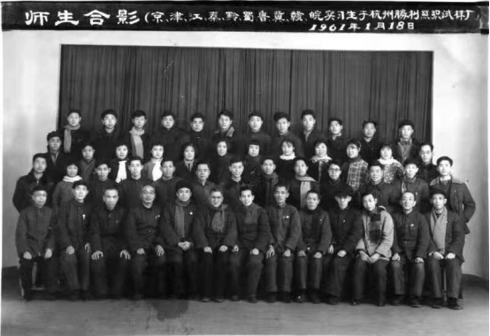 1961年1月18日,赴南方實(shí)習(xí)結(jié)束時(shí)師生在杭州勝利絲織試樣廠合影