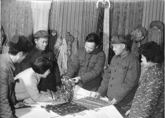 淄博絲織一廠設(shè)計(jì)人員與廠領(lǐng)導(dǎo)在研究花色