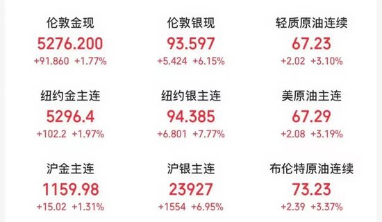 截至今晨收盤,倫敦銀現(xiàn)貨價(jià)格上漲6.15%,紐約期銀主力合約上漲7.77%;倫敦金現(xiàn)貨價(jià)格上漲1.77%,紐約期金主力合約上漲1.97%;WTI原油期貨主力合約和布倫特原油期貨主力合約均漲逾3%。