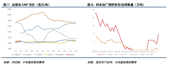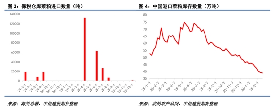 特別地,本次“反歧視”關(guān)稅取消商品名單當(dāng)中并不包括加拿大菜油,換言之目前進(jìn)口加菜油仍需遭受100%關(guān)稅懲罰。從這個(gè)角度來(lái)說(shuō),加拿大菜油短期內(nèi)仍無(wú)法正常對(duì)華出口。另一方面,近期迪拜菜油的CNF參考報(bào)價(jià)仍在1125美元左右,成本端具備一定支撐。目前中國(guó)沿海菜籽庫(kù)存陸續(xù)恢復(fù),但轉(zhuǎn)化為壓榨尚需一段時(shí)間,我們傾向于菜油在短期內(nèi)的供應(yīng)端支撐要高于菜粕。