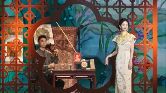 南京云錦傳承人陳誠帶來的高定旗袍“錦繡云間”,歷經(jīng)40余天“極限織造”,沿用最高等級的“妝花緞”技藝,將梅蘭竹菊紋樣做漸變留白設(shè)計,讓“寸錦寸金”的云錦變得輕盈貼合,陳都靈穿上云錦旗袍,贊嘆道“非常喜歡,而且很舒服”;緙絲旗袍?苓霜出自江蘇省緙絲織造技藝非遺代表性傳承人陳文之手,紫色織金緙絲衣料,570個小時的精工細作,讓緙絲“刻縷成畫”的立體美感與吳羅面料相得益彰。舞臺上,宋錦代表性傳承人沈惠攜復(fù)刻故宮文物的宋錦作品亮相,蘇繡代表性傳承人府向紅、府涵璐同臺穿針,蘇州評彈演員沈彬、周麗娟的淺唱低吟,將江南的織造之美、音律之韻融為一體。