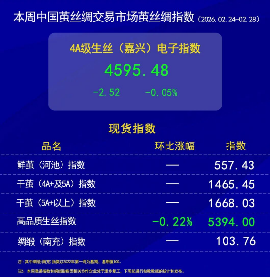 今日(2026年02月28日,周六)中國繭絲綢交易市場生絲電子指數(shù)微跌0.01%報(bào)收于4595.48點(diǎn),本周生絲指數(shù)累計(jì)下跌0.05%,本月生絲指數(shù)累計(jì)上漲0.01%。B絲2022D(商檢4A級(jí)生絲):260325合約報(bào)平,收于45.99萬元;260925合約報(bào)平,收于45.93萬元;270325合約報(bào)平,收于45.81萬元。