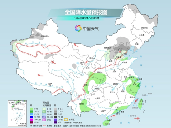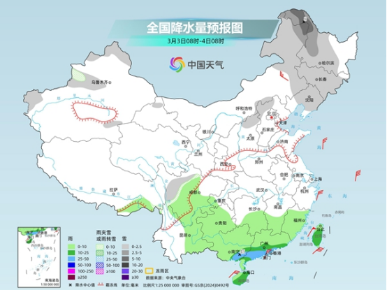 昨天,隨著冷空氣南下,中東部雨雪有所減弱,北方降雪主要出現(xiàn)在華北北部、東北地區(qū)等地,南方較強(qiáng)降雨則出現(xiàn)在華南地區(qū)。監(jiān)測(cè)顯示,昨天8時(shí)至今天6時(shí),內(nèi)蒙古中東部、京津冀、山東中北部及新疆西北部等地部分地區(qū)出現(xiàn)小到中雪或雨夾雪,局地大雪;福建東南部、廣東中南部、廣西南部和西北部等地部分地區(qū)出現(xiàn)中到大雨,局地暴雨。
