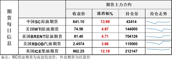 【1】WTI主力原油期貨收漲3.33美元,漲幅4.67%,報(bào)74.56美元/桶;布倫特主力原油期貨收漲3.66美元,漲幅4.71%,報(bào)81.4美元/桶;INE原油期貨收漲13.99%,報(bào)641.1元。