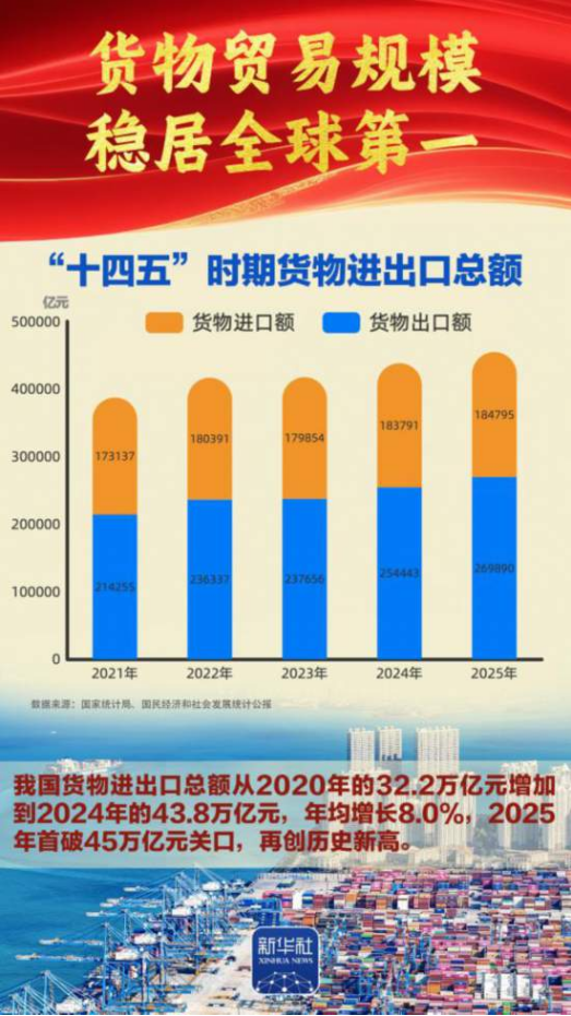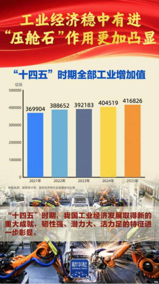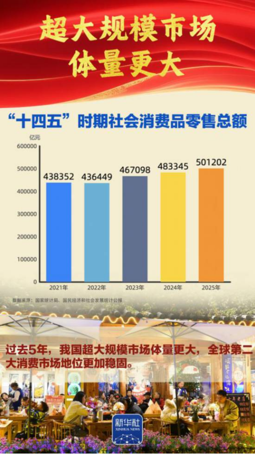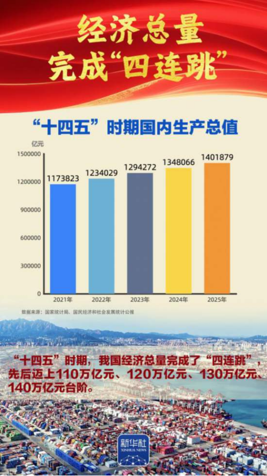 “十四五”勝利收官,“十五五”嶄新開局。我國經(jīng)濟總量完成“四連跳”,躍上140萬億元大關(guān),經(jīng)濟實力、科技實力、綜合國力躍上新臺階,中國式現(xiàn)代化邁出新的堅實步伐,第二個百年奮斗目標(biāo)新征程實現(xiàn)良好開局。2026年全國兩會召開,舉世矚目。我們梳理出九組數(shù)據(jù),一起感受勝利收官的壯闊歷程、啟新開局的高光時刻。