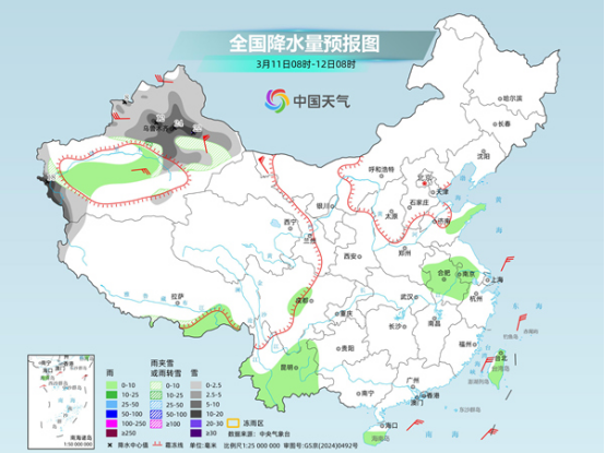 后天,內蒙古東北部和中部、新疆沿天山地區(qū)和南疆山區(qū)、西藏西部和南部、甘肅大部、青海北部和東部等地部分地區(qū)有小到中雪或雨夾雪,其中,新疆東部和南疆山區(qū)等地部分地區(qū)有大到暴雪。新疆南疆盆地、西藏東南部、川西高原東部、陜西、四川盆地中西部、貴州西部、云南、臺灣島等地部分地區(qū)有小雨,局地有中雨。