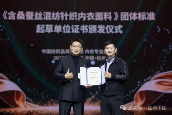 在全場嘉賓見證下,中國紡織品商業(yè)協(xié)會正式授予草本初色《含桑蠶絲混紡針織內(nèi)衣面料》團體標準起草單位證書。