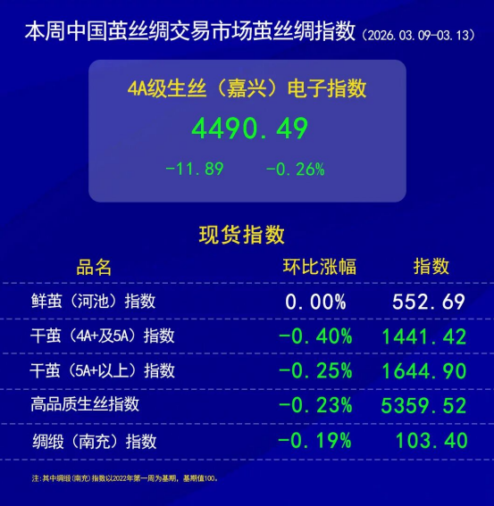 今日(2026年03月13日,周五)中國(guó)繭絲綢交易市場(chǎng)生絲電子指數(shù)微跌0.02%報(bào)收于4490.49點(diǎn),本周生絲指數(shù)累計(jì)下跌0.26%。B絲2022D(商檢4A級(jí)生絲):260325合約報(bào)平,收于44.94萬元;260925合約下跌0.03萬元報(bào)收于44.85萬元;270325合約下跌0.03萬元報(bào)收于44.79萬元。