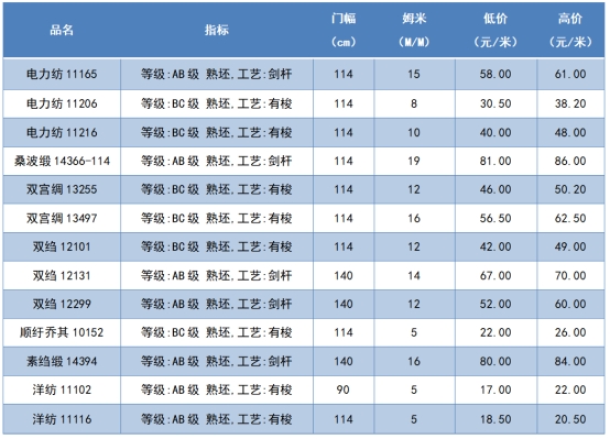 本周綢緞指數(shù)協(xié)作單位成交價(jià)格區(qū)間