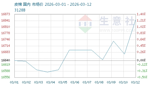 3月以來國內(nèi)棉花價格呈現(xiàn)先抑后揚的走勢。截至3月12日3128B級皮棉現(xiàn)貨價格在16694元/噸,單日漲幅達(dá)1.04%,較月初上漲1.24%,創(chuàng)下本月迄今最高點。