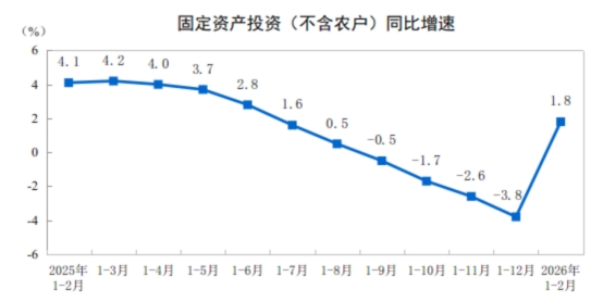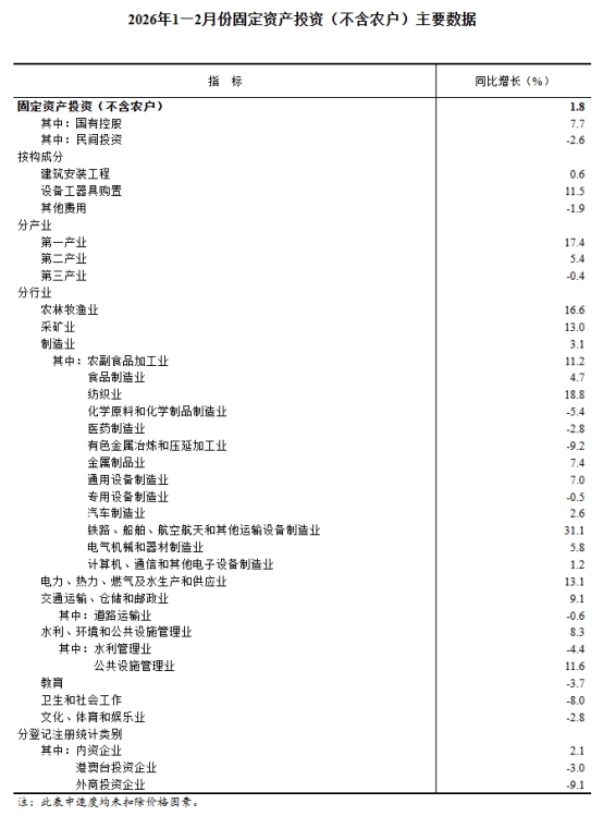 1—2月份,全國(guó)固定資產(chǎn)投資(不含農(nóng)戶)52721億元,同比增長(zhǎng)1.8%(按可比口徑計(jì)算,詳見(jiàn)附注7)。其中,民間固定資產(chǎn)投資同比下降2.6%。從環(huán)比看,2月份固定資產(chǎn)投資(不含農(nóng)戶)增長(zhǎng)0.39%。