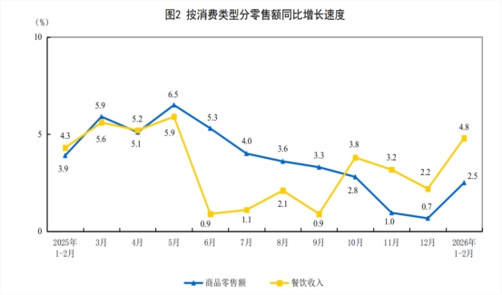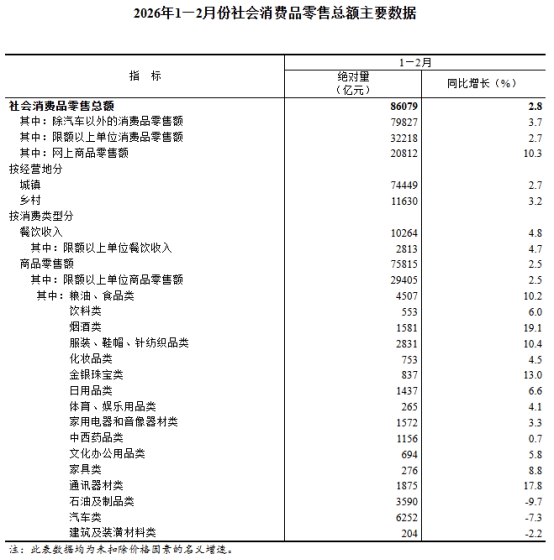 2026年1—2月份社會(huì)消費(fèi)品零售總額增長(zhǎng)2.8%