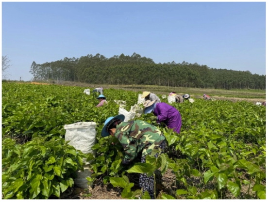 3月13日,在石別沙坪小蠶共育基地周邊的桑園里,成片桑樹郁郁蔥蔥,鮮嫩桑葉掛滿枝頭,工人們正忙著采摘、分揀、裝運(yùn)新鮮桑葉,一派豐收忙碌的景象?!艾F(xiàn)在我們?cè)诩規(guī)屠习迥锸杖~子,一個(gè)月大概有4000塊錢的收入,然后也可以照顧小孩、照顧老人,我覺得非常好?!辈烧H~的工人韋媛林笑著說道。
