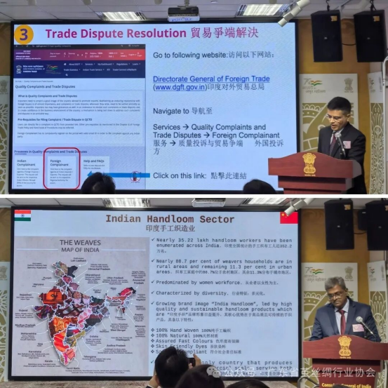 會上,協(xié)會常務(wù)副會長、廣東絲源集團(tuán)有限公司董事長、總經(jīng)理梁駿圍繞廣東省繭絲綢產(chǎn)業(yè)概況,對印度出口生絲及服裝情況,廣東核心優(yōu)勢與中印合作建議三方面進(jìn)行題為《廣東省繭絲綢產(chǎn)業(yè)及對印出口情況介紹》的宣講,殷切期待廣東企業(yè)始終以開放包容的姿態(tài),深耕印度市場,深化合作,共筑絲綢產(chǎn)業(yè)高質(zhì)量發(fā)展的新輝煌。印度駐穗領(lǐng)館官員,印度紡織部,印度手織布出口促進(jìn)會等印度官員全面介紹了印度進(jìn)口生絲關(guān)稅及貿(mào)易爭端解決方案,印度絲綢產(chǎn)業(yè)概況,印度手工織造業(yè)及邀請參加今年7月份在印度舉辦的展會。隨后問答環(huán)節(jié)就關(guān)注的議題展開熱烈探討,雙方探討關(guān)稅壁壘問題,希望努力克服困難做得更好;對企業(yè)關(guān)注進(jìn)口小批量印度商品運(yùn)輸及清關(guān)手續(xù)問題,現(xiàn)場印方官員逐一回應(yīng),為后續(xù)合作奠定堅(jiān)實(shí)基礎(chǔ)。