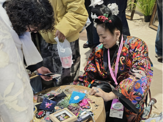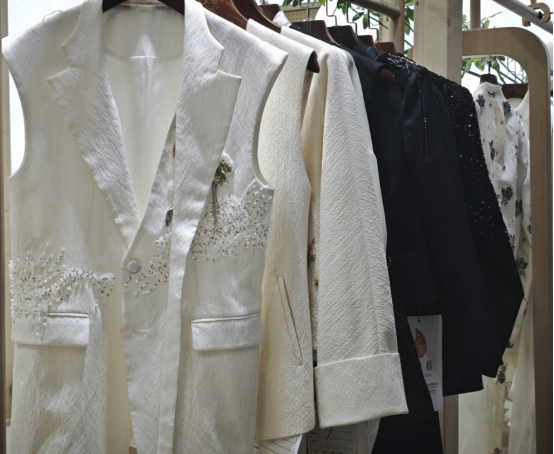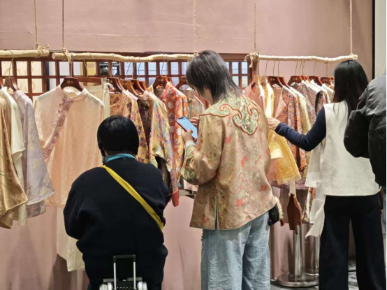 采訪中,一品華裳的創(chuàng)始人張博介紹,服裝行業(yè)傳統(tǒng)的代理體系和門(mén)店體系正面臨沖擊,“舊時(shí)代的壇壇罐罐已經(jīng)打碎了,新時(shí)代長(zhǎng)什么樣,我們也不知道”。他們的探索是:讓產(chǎn)品成為其他品牌的“插件”,與大多數(shù)專注于服裝品類的展商不同,“我們做的是‘錦上添花’的生意,也就是刺繡。我們與成熟的女裝店合作,在同一個(gè)空間里補(bǔ)充國(guó)風(fēng)配飾;與面料品牌聯(lián)動(dòng),也為頭部品牌提供伴手禮和秀場(chǎng)周邊?!睆埐┙榻B。