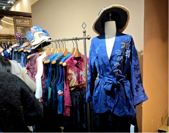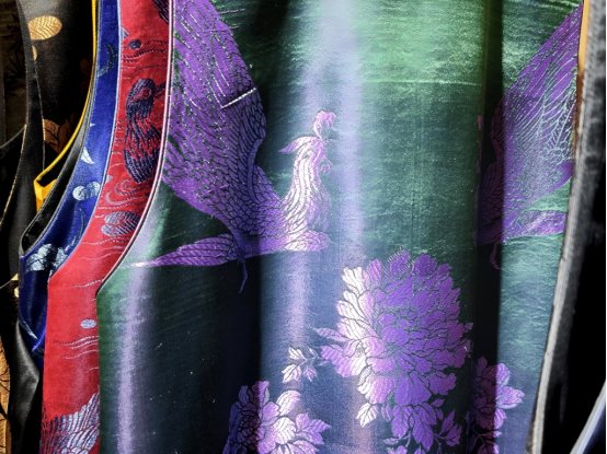 王女士也介紹了一種很稀缺但很有特色的產(chǎn)品——用老緞面制成的衣服?!斑@些老緞面,都是七八十年代,甚至五六十年代農(nóng)村結(jié)婚時(shí)留下的老被面,桑蠶絲的質(zhì)地,保存完好,很多甚至從未使用過(guò),我們回收回來(lái),然后做成衣服?!蓖跖拷榻B,這些老緞都是用以前的小機(jī)器織的,手感柔和。放了五六十年,顏色會(huì)變得更加溫潤(rùn),不像新織出來(lái)那種緞面很亮、很扎眼。