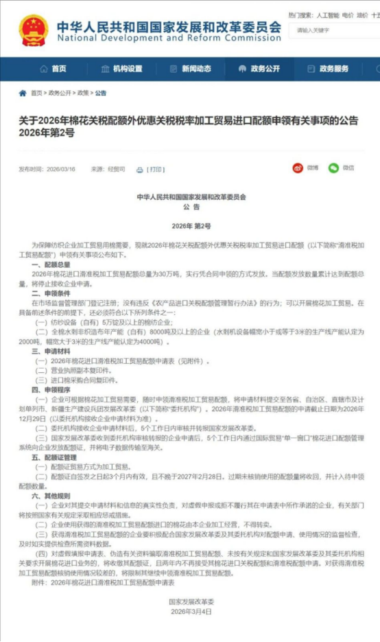 2026年3月16日,國家發(fā)展改革委就2026年棉花關(guān)稅配額外優(yōu)惠關(guān)稅稅率加工貿(mào)易進(jìn)口配額(以下簡稱“滑準(zhǔn)稅加工貿(mào)易配額”)申領(lǐng)有關(guān)事項發(fā)布公告,2026年棉花進(jìn)口滑準(zhǔn)稅加工貿(mào)易配額總量為30萬噸,實行憑合同申領(lǐng)的方式發(fā)放。當(dāng)配額發(fā)放數(shù)量累計達(dá)到配額總量,將停止接收企業(yè)申請。詳細(xì)申領(lǐng)規(guī)則見國家發(fā)展改革委官網(wǎng)公告原文。