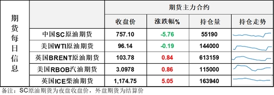 【1】WTI主力原油期貨收跌0.68美元,跌幅0.19%,報96.14美元/桶;布倫特主力原油期貨收漲0.86美元,漲幅0.84%,報103.78美元/桶;INE原油期貨收跌5.76%,報757.1元。