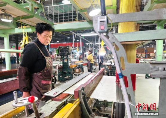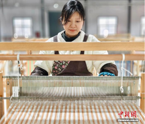 圖為工人在手工織機(jī)上織圍巾