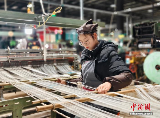 圖為工人在手工織機(jī)上捻頭