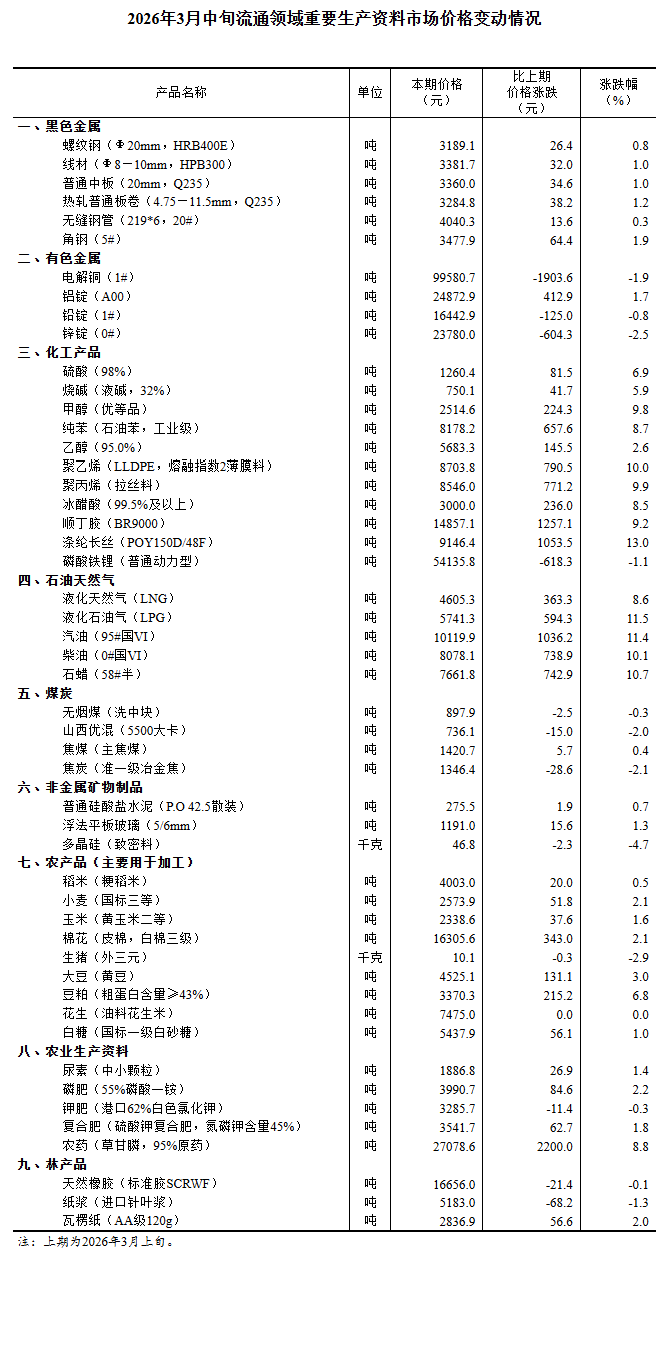 2026年3月中旬流通領(lǐng)域重要生產(chǎn)資料市場價格變動情況