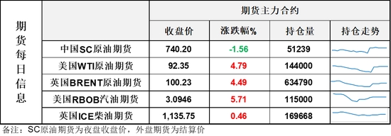 【1】WTI主力原油期貨收漲4.22美元,漲幅4.79%,報92.35美元/桶;布倫特主力原油期貨收漲4.31美元,漲幅4.49%,報100.23美元/桶;INE原油期貨收跌1.56%,報740.2元。