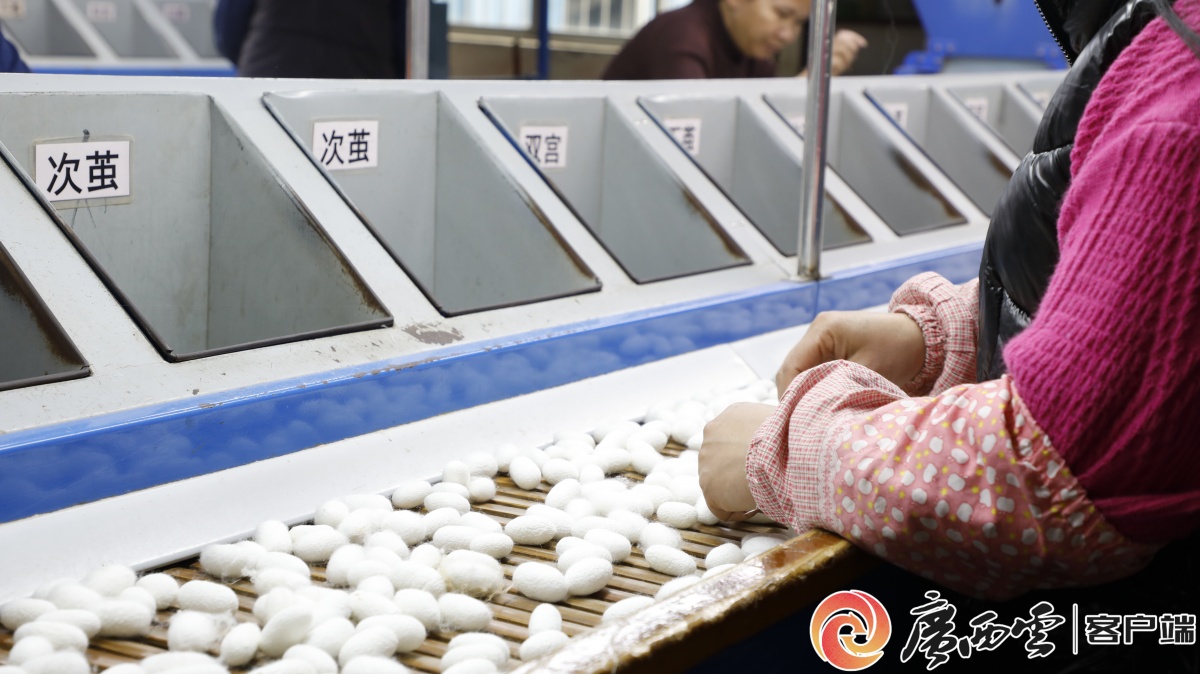 在原料源頭,公司與象州蠶?,F(xiàn)代農(nóng)業(yè)園區(qū)深度合作,為合作農(nóng)戶提供優(yōu)質(zhì)蠶種和全程免費技術(shù)指導(dǎo),從蠶種培育、小蠶共育、大蠶飼養(yǎng)到防病、上蔟,技術(shù)員手把手教學(xué),同時指導(dǎo)農(nóng)戶建設(shè)標準化蠶棚,共享軌道車、采繭機等設(shè)備,降低農(nóng)戶投入的同時,確保蠶繭原料的優(yōu)質(zhì)率。
