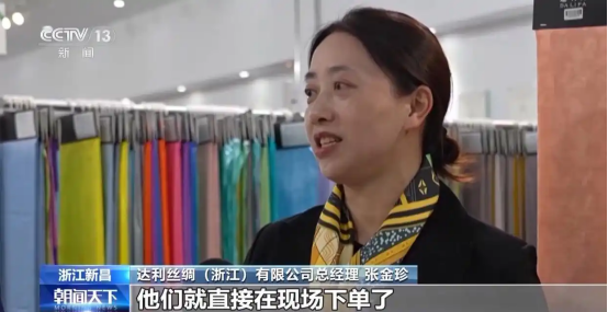 達(dá)利絲綢(浙江)有限公司總經(jīng)理 張金珍:包括從美國、德國過來的客戶,有的客戶看到我們一些心儀的產(chǎn)品,他們就直接在現(xiàn)場(chǎng)下單了。